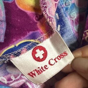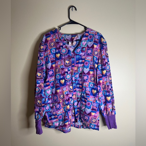 Vibrant scrub jacket with heart and floral patterns. Long sleeves with cuffed ends. Button-up front. Perfect for a bold look.