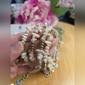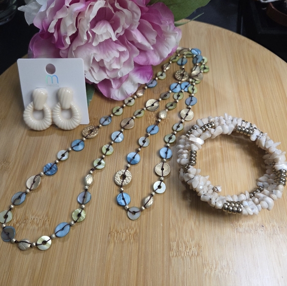 Enhance your style with this elegant multicolor shell necklace and bracelet set. Perfect for any occasion, this set features beautiful gold and blue tones that add a touch of sophistication to your outfit.