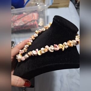 Elegant multicolor shell necklace perfect for any occasion. Features a blend of pink, cream, and tan hues for a natural look.