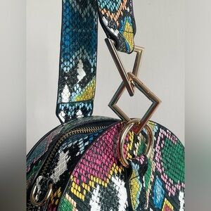 The matching round bag is a perfect companion to the shoes, featuring the same vibrant snakeskin pattern.