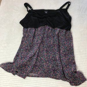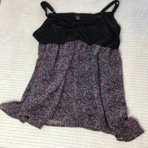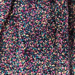 Adorable black fitted top, with chiffon overlay starting at waist. Super cute, flattering fit. Chiffon looks like confetti with purple, pink, teal, yellow and coral colors. Smocked back and adjustable straps for great fit.