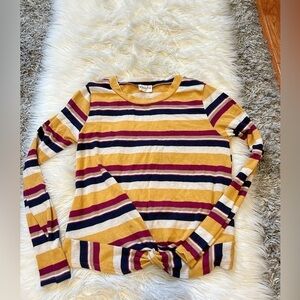 This Trendy J’s striped tie-front top is a versatile piece that can be dressed up or down. The soft, comfortable material and flattering fit make it perfect for any occasion. The multicolored stripes add a touch of fun and style, while the tie-front detail creates a unique and trendy look. This top is a must-have for any fashion-forward woman.