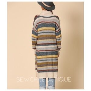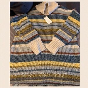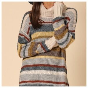 Love this Sweater Dress!!! Multi-color horizontal striped turtleneck maxi length sweater dress with slits up the sides. The slits go 2 the top of the thigh & goes perfectly with jeans or pants. Wear it with tights & boots too. I think this is beautiful & I only wish I could wear it. I want to keep 1 just 2 stay warm in NY when I go. ππ. Soft knit, almost looks like a waffle knit but itβs not.
