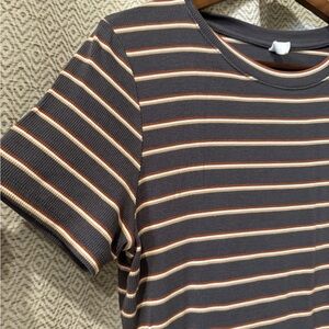 Charcoal gray striped tee with white, rust and tan colors. Only worn twice, great condition! Looks great with jeans or slacks.