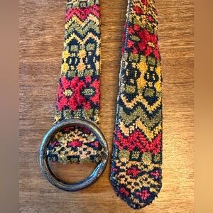 This multicolor patterned belt features a stylish blend of red, yellow, and black threads and a metal buckle. 38 inch total length.