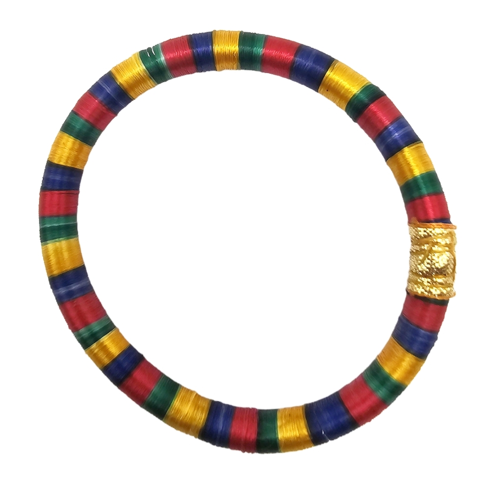 This vibrant bangle features a striking design with tightly wrapped colored threads, creating a bold and textured look. The alternating bands of red, green, blue, and yellow threads give it a playful and eye-catching appeal. The bangle is finished with a gold-tone accent piece, adding a touch of elegance.