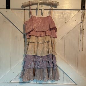 Stunning tiered ruffle dress with pink, cream, and purple layers. Perfect for special occasions.