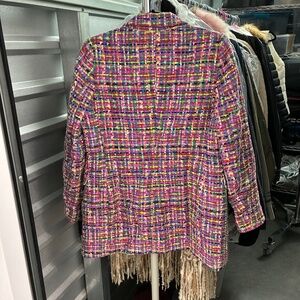 How cute is this blazer? Multicolored tweed blazer from Vilagallo. Even the liner is adorable and colorful. Dominant color is a hot pink, with strands of pink, blue, yellow and purple. Reminds me of confetti. I really don’t want to sell this one but I will if you want to pay what I think it is worth. If not, it’s mine.