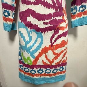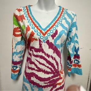 Vibrant and stylish, this multicolor V-neck dress features a unique pattern. Perfect for any occasion, it combines comfort with a bold design.