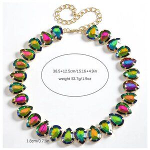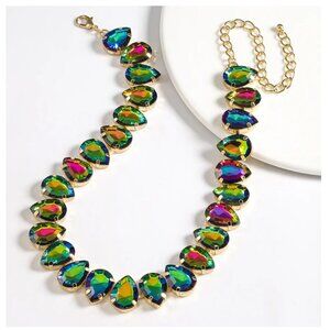Elegant and vibrant, this necklace features multicolor glass teardrops set on a gold tone chain. Perfect for adding a touch of glamour to any outfit.