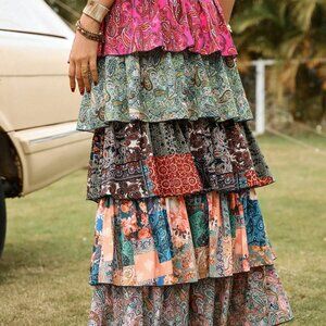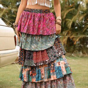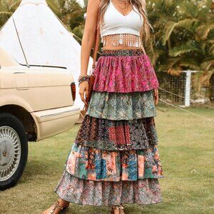 Multicolor Women's Boho Printed High Waist Loose Ruffle Trim Maxi Skirt