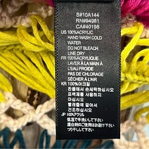 Vibrant crochet vest with fringe detail. Features bold pink, yellow, and black patterns. Perfect for layering and adding flair. Used good condition. PTP 20 inches. Length 29 inches.