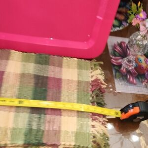 Set of 8 Beautiful placemats multicolor woven rug with a striped pattern. Features shades of pink, green, and cream.