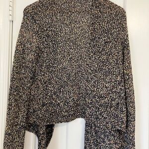 Draped cardigan with a varigated weave. Includes light blue, navy, light pink and yellow tones. Fabric moves well and does not wrinkle. A useful layer for cool offices or to add color to basic outfits.