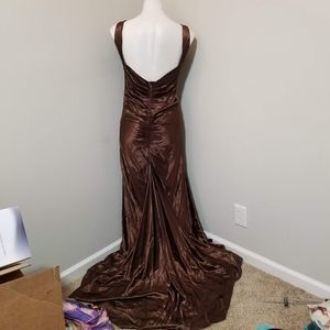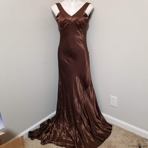Sz 13 (fits modern 8ish imo)Y2K Vintage Zum Zum Niki Livas Chocolate Brown Satin Mermaid Gown w Butt Ruching and TrainMeasurements in photos but the gathers built into the bust and bias cut give more room than they would show. About 59.5 long in front train is much longer. Left side zip. Rayon/acetate satin.VGUC-- Has a couple small dust spots near the back train hem that are only visible when inspecting closely as well as a tiny worn spot in the fabric just under the tip of the v neckline. This is not visible during wear and I only spotted it when I was holding the dress up to the light. I also felt some pilling inside when laying out the dress to measure it but this does not appear on the outside. I am happy to run my fabric shaver over it before shipping if you think you would feel it. (This may just add a day to ship time)This is such an elegant gown in the typical 2005 style with the thick strapped V neckline and gathered bust. NO MODELS-TRADES-LOWBALLS' Tags: mermaid, floor length, size l, vintage, plus size, satin, zum zum by niki livas, multicolor, size 12, train