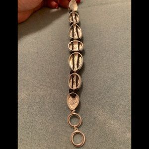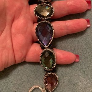 Adjustable bracelet measures 8.5 to 9 inches at the longest. Beautiful silver tone with lilac, smoky blue, gray, green and golden stones. Originally purchased at Dillard’s but have not worn.