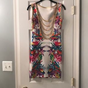 Multicolor backless fitted dress with open back and gold chains accented.