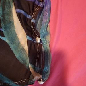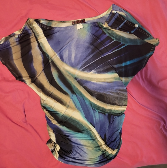 gently used blouse with buttoned peep hole sleeves. Ruched sides