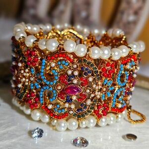 this is a indian style bracelet called Nauratani Kardda it's made with pearls & stones and it's openable the size is 2.8 and will easily fit anyone that wear 2.6 or 2.10 as well.