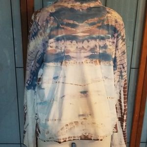 Cream, blue and brown open front light weight jacket. Missing tag but is size large. Collar to bottom 22" in. Sleeves 20"-27" in.