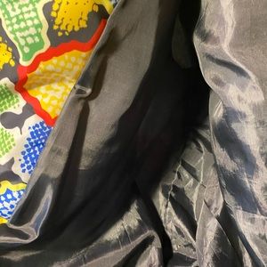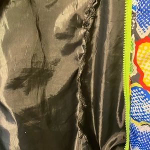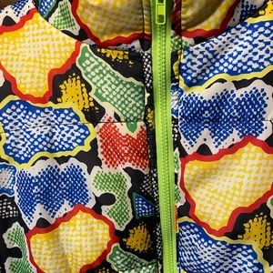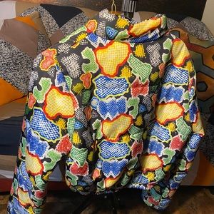 Multi color waist length puffer jacket can be worn with a hoodie underneath. Had a slight web but I have sown it so there’s no longer a tear