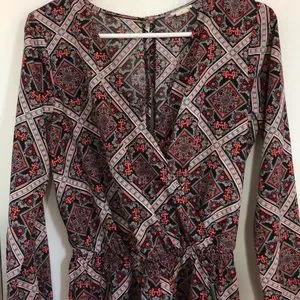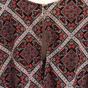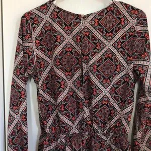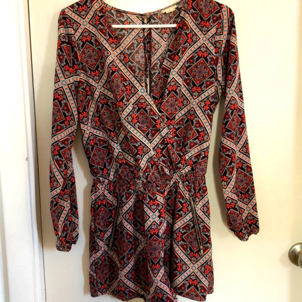 Fun romper. Bright pink, purple, teal, and black colors. Zipper pockets. V neck