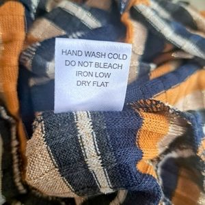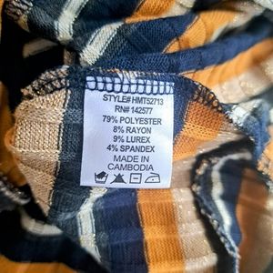 Gold and blue multicolored striped, long sleeve fitted stretch top, with twist detail on front bottom. NWT