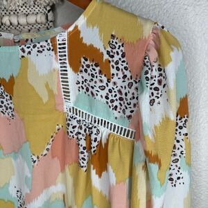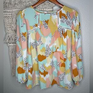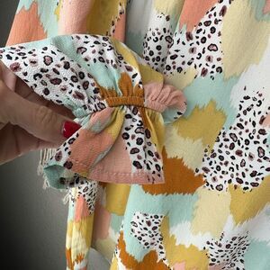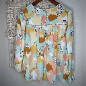 Size small. Preowned, no flaws. Excellent condition. Easy to dress up or down. Adorable abstract watercolor blouse with cheetah print.