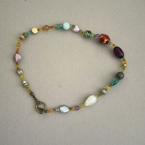 This vibrant multicolor beaded necklace is a stunning addition to any jewelry collection. Featuring a mix of colors including pink, purple, and gold, it offers a unique and stylish look. Perfect for adding a pop of color to any outfit.