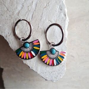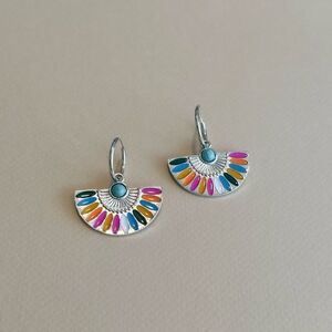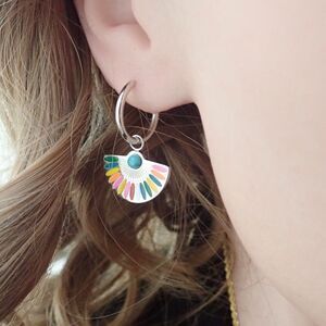 Add a pop of color to your outfit with these vibrant fan-shaped earrings. Perfect for any occasion.