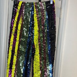 Vibrant sequin pants with multicolor stripes. Perfect for a bold statement. Worn once