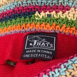 Multicolor straw hat. Folds for travel. Red straw tie . One Size.