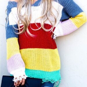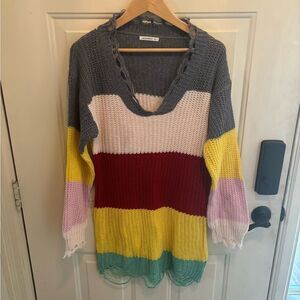 Embrace vibrant style with this multicolor V-neck sweater. Perfect for adding a pop of color to your wardrobe.