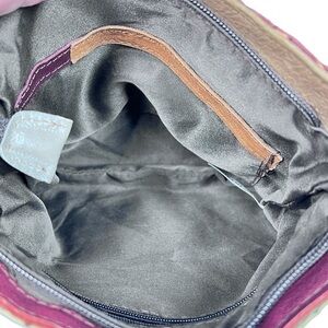 Elevate your chic, boho style with this colorful, artistic shoulder bag crafted from genuine leather. It features layered 3D floral leather cut-out designs on both the front and back. Each flower has a rhinestone center, adding a touch of sparkle and glamour to the design. The bag comes with a removable silver-tone metal chain shoulder strap, offering versatility in how its carried - either as a shoulder bag or a clutch. Inside, the bag is lined with brown polyester fabric and includes one slip pocket, one zippered pocket and one roomy compartment with a secure top zipper closure and leather pull-tab.