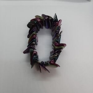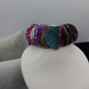 This stunning bracelet features beautiful multicolored beads made of abalone shell, creating an eye-catching asymmetrical design. The stretch bracelet is perfect for any wrist size and can be worn for any occasion. The beads are accented with a charming bead charm, adding a touch of elegance to the piece. The main stone, mother of pearl/abalone, has been treated with a special dye to enhance its natural beauty. Add this unique and stylish bracelet to your jewelry collection today!