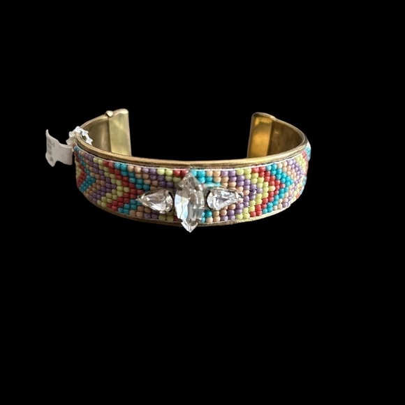 This Stephan & Co. multicolored beaded cuff bracelet has a crystal accent that is boho with a little bling. Bead colors include blue, pink, purple, red, yellowish green. Aprox. 2 3/4” opening with a bendable cuff to slightly adjust size.