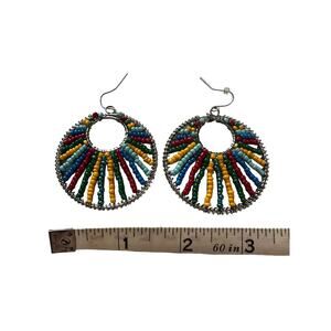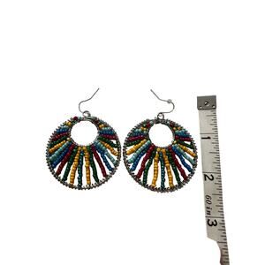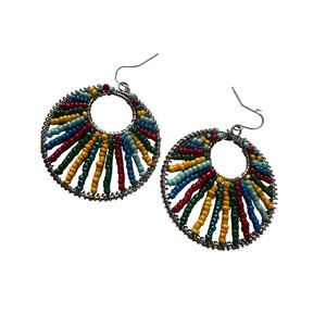 Show your colorful side with these seed bead circle earrings. The beads are in vibrant red, green, yellow, blue, aqua and teal tones in the silver hoops. They're perfect for adding that big pop of color to an outfit. Dress them up, wear them casual with a tee, they'll go with just about anything! They measure 2 1/2" long by 1 3/4" wide. Medium weight and easy to wear!
