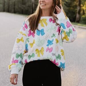 Designed to brighten up your wardrobe, this sweatshirt is a playful statement piece that adds a touch of fun to any outfit. Crafted from soft and comfortable fabric, this sweatshirt features an eye-catching print of colorful coquette bows scattered across the surface. The cheerful design is perfect for those who love to embrace bold and lively fashion trends. Whether you're lounging at home, running errands, or meeting up with friends, this sweatshirt is the perfect choice for adding a pop of color to your look. Pair it with your favorite jeans or leggings for a casual yet stylish ensemble that's sure to turn heads.