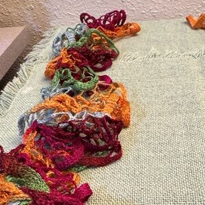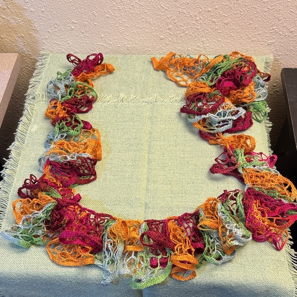 A bright beautiful hand crocheted vintage ruffle scarf. Ask any questions before purchasing and I will try to answer them or send more pictures. Sold as is.