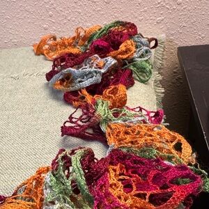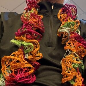 Dress-up any outfit with this beautiful hand crocheted ruffled neck scarf. Approximately 60 inches long.