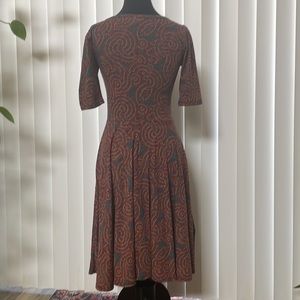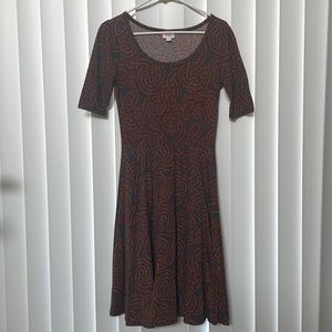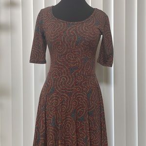 Perfect for Fall! This dress is super cute and comfy. Size small, but fits like a woman’s size 8. Multicolored and versatile. Can work in soo many different looks. Worn, but still in good condition. One small 3inch area on left hip area shows some pilling (pictures). See pictures for measurements.