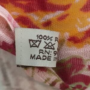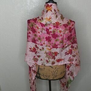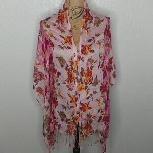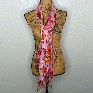 Pink and multicolored floral fringe hem scarf. 100% rayon.