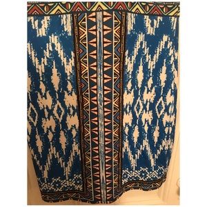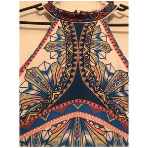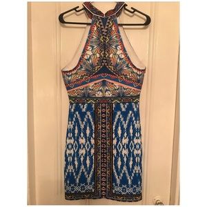 Form fitting dress (runs on the smaller side). Multi-colored, geometric pattern, halter neck. Same pattern is repeated on the back. Zipper closure along the top half of back.