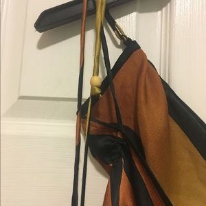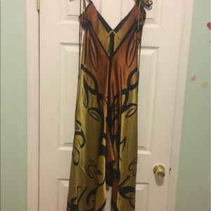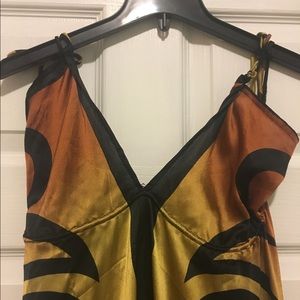 This sexy dress is a great addition to any closet. With the low cut v neck and even lower cut back, you are sure to turn heads. The dress has a stain on the back bottom of the dress. Priced accordingly.