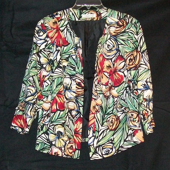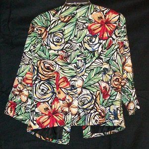 Whimsical colorful jacket. This was designed without buttons. Tag looks like it says medium from picture shown but is in fact a size 14. Great condition!