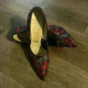 Vintage lace pumps in good condition for age. Size of shoe not visible. Based on measurements shoe is most likely 5.5 narrow. Length of shoe from inside toe to inside heel is just under 9 inches and wide of shoe at the toe is 3 inches. Heels are about 3.5 inches.