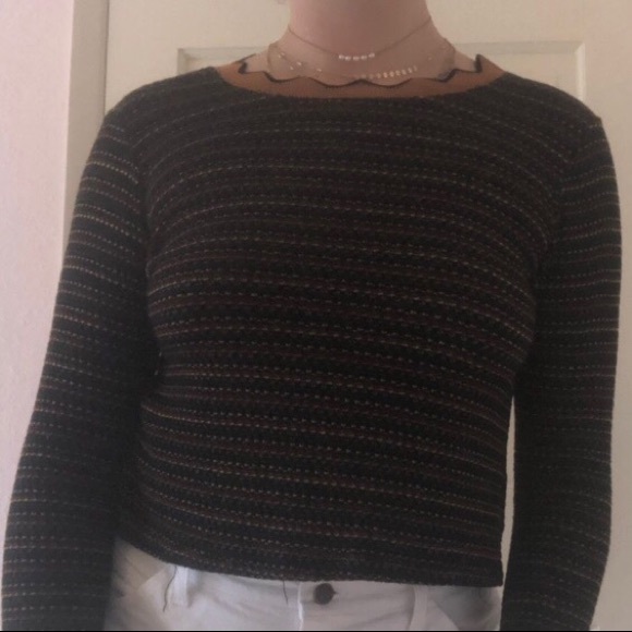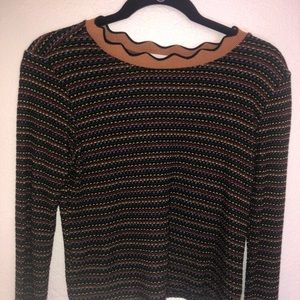 Super unique thrifted mock neck sweater. Lightweight, good for all seasons. Rainbow stripes with a burnt orange scalloped collar. In great condition!