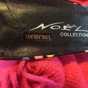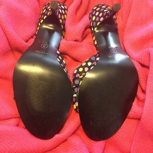 A fun pair of polka dot, silk like fabric heels. They are a scuff style, easy on, easy off. The front of the shoe is gathered and has a cute shoe clip (permanent) to add an extra touch. The heels are 3 inches. These shoes have never been worn.