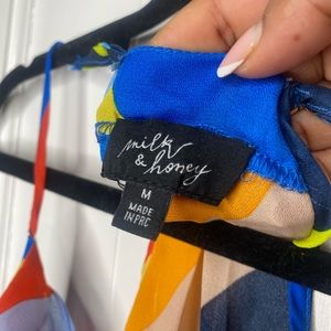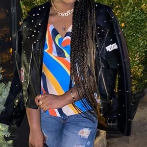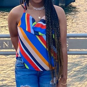 Lightly worn (Once) cowl neck multicolored blouse. Fits true to size and has adjustable straps. Material is 100% polyester