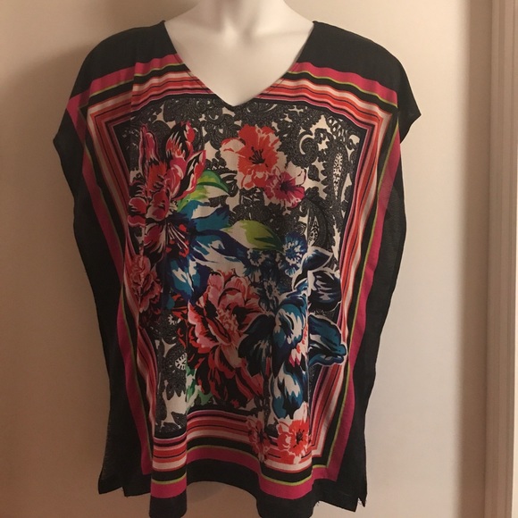 Beautiful multi-colored top by Rafaela. Has side panels for room. Great to cover love handles! Goes great with shorts and jeans.
